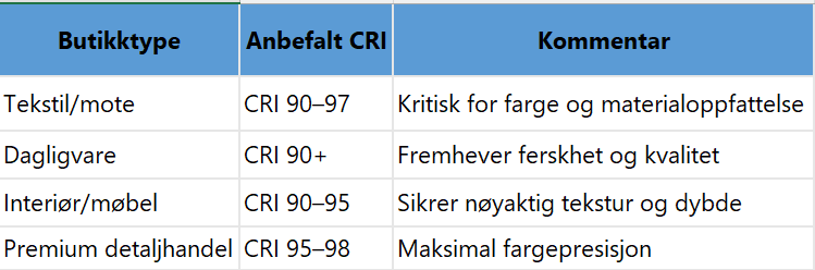 CRI (Colour Rendering Index) beskriver hvor godt en lyskilde gjengir fargene i et objekt sammenlignet med dagslys (som har CRI 100). I butikkmiljø er dette særlig viktig fordi: